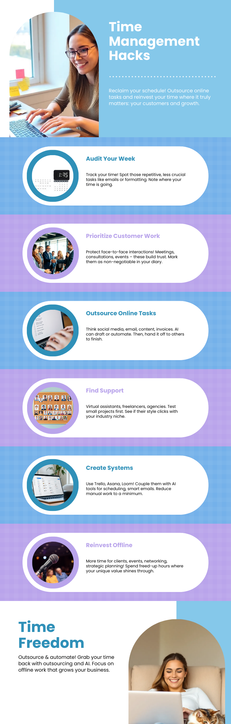 The takeaway: Your inbox may feel urgent, but your customers are important. Don’t confuse the two. By outsourcing the online—and leveraging AI where it makes sense—you free yourself to show up offline, where loyalty is built, opportunities unfold, and your expertise shines.